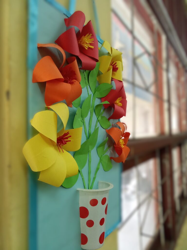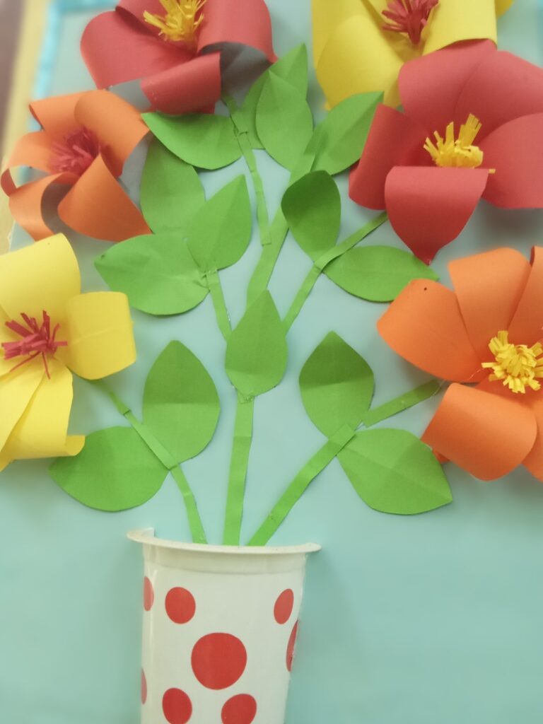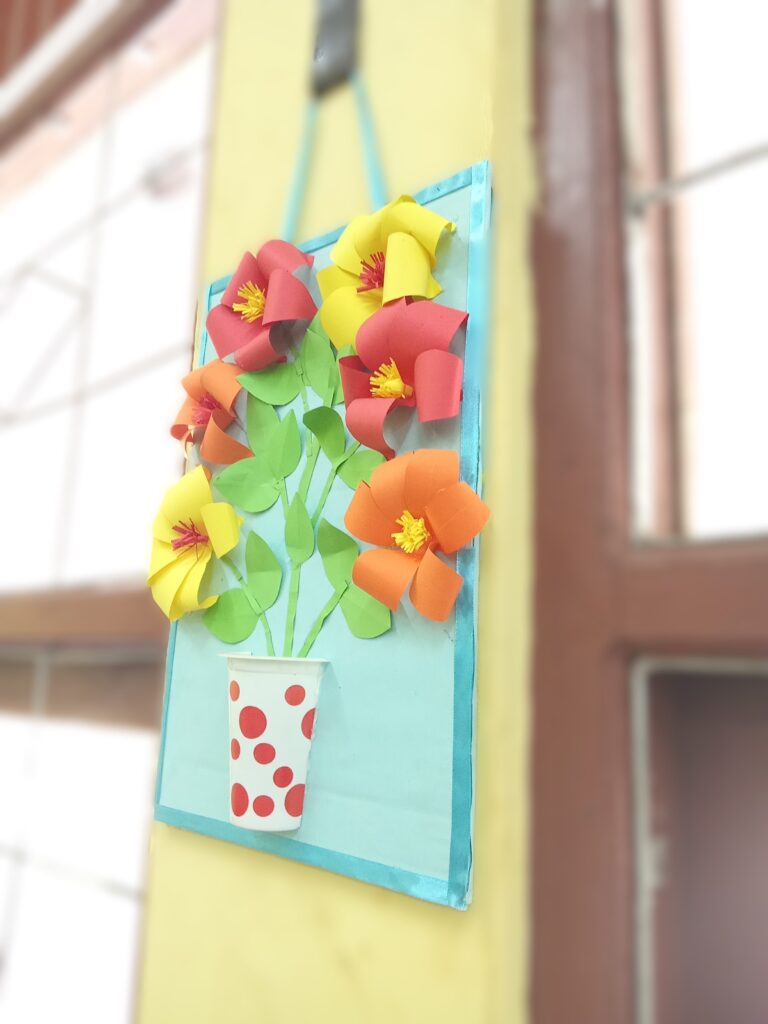 - Untuk memberi sentuhan lebih menarik, kamu bisa menambahkan daun dari potongan kertas hijau kecil di sekitar bunga.
